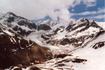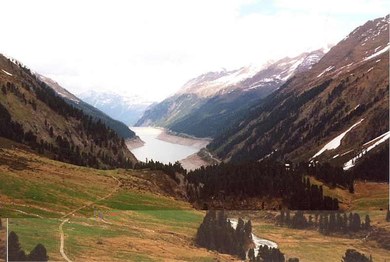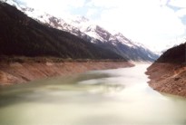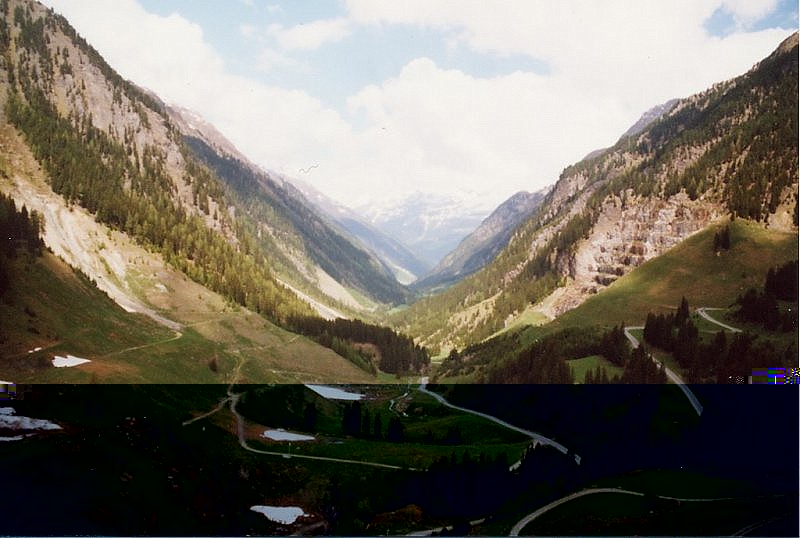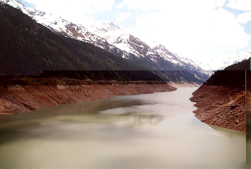 | Hier beginnt die 26km lange Gletscherstraße, und es wird wieder interessanter. Auf dem Weg zum Staudamm des Gepatschstausees steigt die Straße nun steiler und mit gelegentlichen Kehren an. An den Hängen oberhalb der Straße sind deutlich die Steinbrüche zu erkennen, aus denen die Steine für den Damm geschlagen wurden. |