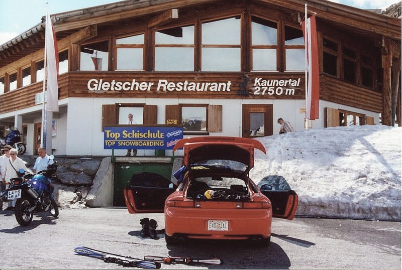 | Wir erreichen den Parkplatz am Endpunkt und sind erstaunt. Nachdem wir auf der Straße mehr das Gefühl hatten allein unterwegs zu sein, finden wir einen gut gefüllten Parkplatz vor. Sogar zwei Reisebusse haben sich nach oben gearbeitet. Auch ein paar Barchetta Fahrer haben heute diese schöne Strecke gewählt, und parken ihre fünf Cabrios in einer Reihe an der Straße. Einige der anderen Autos haben Skiträger. Das interessanteste: ein Mitsubishi GT3000 mit Kennzeichen aus Florida. |